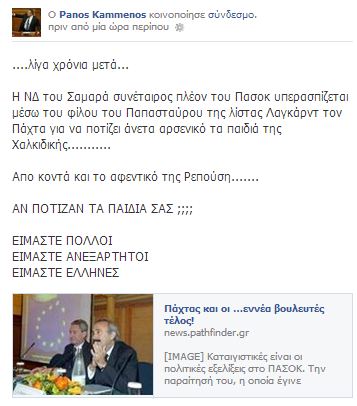 «Πρέπει ο Πάχτας να μην μπορεί να κυκλοφορήσει, λιντσάρετέ τον» είπε χαρακτηριστικά ο κ. Καμμένος, όταν κάτοικοι της Χαλκιδικής του έθεσαν το ζήτημα με την εμφάνιση τιμών αρσενικού πάνω από τα επιτρεπτά όρια στις γεωτρήσεις του Νεοχωρίου.