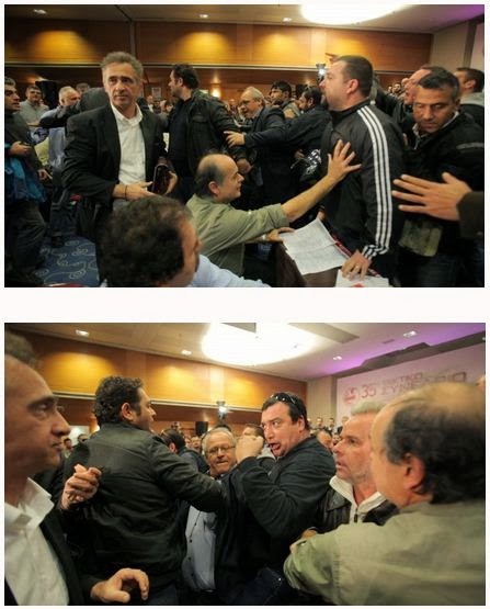 Όταν αποχωρούσαν δημιουργήθηκε και πάλι ένταση όταν συνδικαλιστές του ΣΥΡΙΖΑ τους είπαν εγκάθετους της Νέας Δημοκρατίας. Ακολούθησαν σκηνές απείρου κάλους με κυνηγητό μέσα στην αίθουσα του συνεδρίου, προπηλακισμούς και χειροδικίες, αναφέρει το newsit.