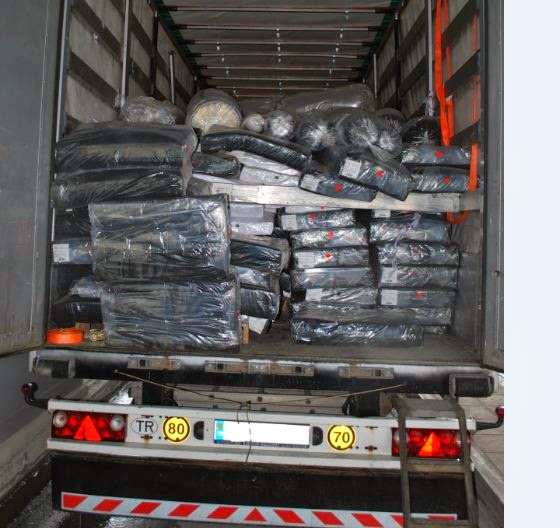 Διαπιστώθηκε επίσης ότι οι καρότσες των οχημάτων έφεραν σφραγίδες τελωνείου, τα σύρματα των οποίων ήταν παραβιασμένα και επιμελώς επανασυνδεμένα, προκειμένου να παραπλανηθούν οι ελεγκτικές Αρχές ενώ τα φορτηγά μετέφεραν παλέτες και υφάσματα.