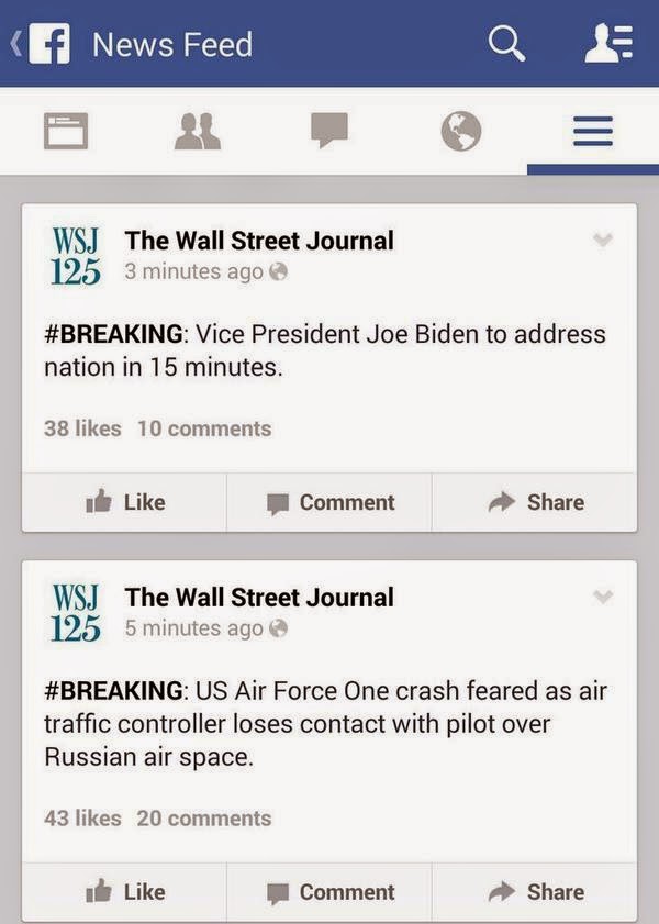 Παγκόσμια αναστάτωση προκλήθηκε όταν χάκερ εισέβαλλε στον επίσημο λογαριασμό της Wall Street Journal και έγραψε πως υπάρχει φόβος ότι συνετρίβη του αεροσκάφος του Oμπάμα, αφού το κέντρο ελέγχου έχει χάσει την επαφή με το US Air Force One.