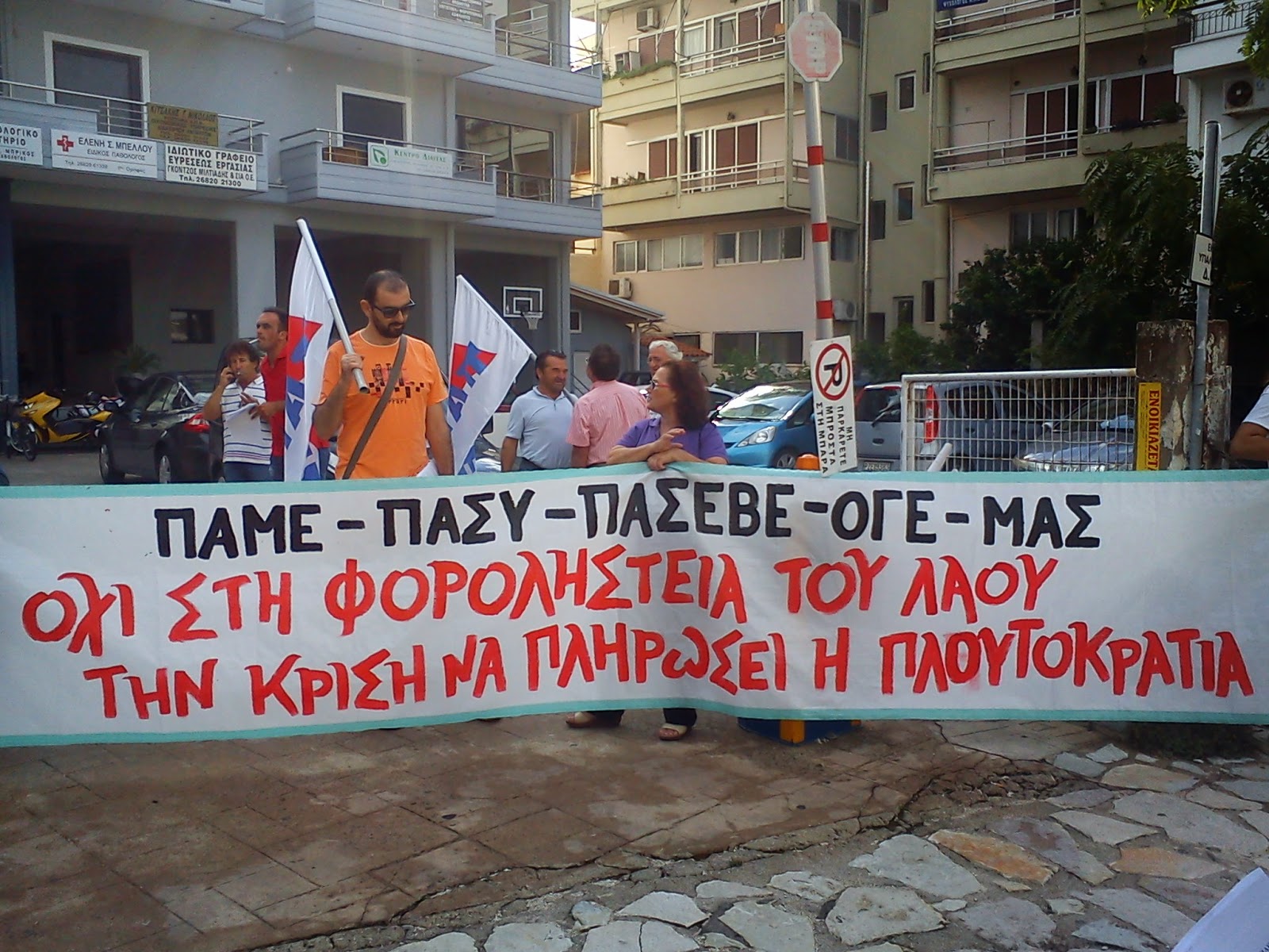 Πραγματοποιήθηκε την Τετάρτη 3 Σεπτέμβρη έξω από την εφορία Πρέβεζας, από τις δυνάμεις του ΠΑΜΕ, του Συλλόγου Γυναικών, της ΠΑΣΥ του ΜΑΣ, της ΠΑΣΕΒΕ παράσταση διαμαρτυρίας ενάντια στην φορομπηχτική πολιτική της συγκυβέρνησης ΝΔ-ΠΑΣΟΚ. Συνδικαλιστές εργάτες, αγρότες, γυναίκες νεολαία καλούσαν τον κόσμο να μη σκύψει το κεφάλι σε αυτή την φορεπιδρομή, στην προσπάθεια συγκέντρωσης της ακίνητης περιουσίας σε λίγα χέρια. Που με μαθηματική ακρίβεια θα ξεκληρίσει αγρότες, θα πετάξει έξω από τα σπίτια εργάτες, αυτοαπασχολούμενους κλπ. Μοίρασαν ανακοινώσεις, ενημέρωσαν, συνομίλησαν με τον κόσμο που πήγαινε στην εφορία, άκουσαν τα παράπονά τους, τον κάλεσαν να αντιδράσει στην πολιτική που τσακίζει τη ζωή του και τα δικαιώματά του. Η Γραμματεία Πρέβεζας του ΠΑΜΕ καλεί τους εργαζόμενους να συμμετέχουν στις αγωνιστικές δράσεις που το επόμενο διάστημα θα πραγματοποιηθούν. Αγωνιστικές δράσεις ενάντια σε όλα τα μέτωπα που σήμερα ανοίγει η κυβέρνηση απέναντι στα λαϊκά στρώματα.