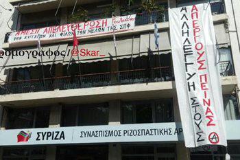 Συμβολική κατάληψη πραγματοποιούν αντιεξουσιαστές στα γραφεία του ΣΥΡΙΖΑ στην πλατεία Κουμουνδούρου, διαμαρτυρόμενοι για τη λειτουργία φυλακών τύπου Γ'.