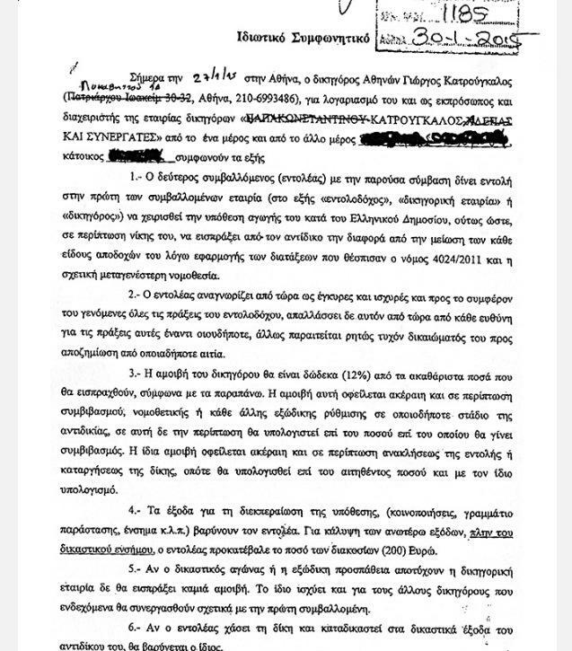 Αυτή τουλάχιστον είναι η ημερομηνία που πρωτοκολλήθηκαν (μπορεί να είχαν κατατεθεί νωρίτερα) στον Δικηγορικό Σύλλογο Αθηνών τα 22 ιδιωτικά συμφωνητικά στα οποία προβλέπεται δικηγορική αμοιβή 12%, επί του ποσού που θα επιδικαστεί στους προσφεύγοντες για μισθολογικές διαφορές κατά του Δημοσίου. Μάλιστα τα 22 συμφωνητικά φέρονται να υπογράφονται από τον κ. Κατρούγκαλο ως εκπρόσωπο της δικηγορικής εταιρείας "Κατρούγκαλος και Συνεργάτες", η οποία φέρεται ότι διαλύθηκε στις 17 Φεβρουαρίου 2015, δηλαδή λίγες μέρες αργότερα. Αυτά φέρεται να προκύπτει ότι υπογράφηκαν 26 και 27 Ιανουαρίου 2015, μια-δυο ημέρες δηλαδή μετά τις εκλογές του Ιανουαρίου.