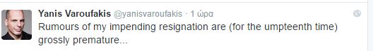 Με ένα Tweet ο Γιάννης Βαρουφάκης απαντάει ότι είναι ''Πρόωρες οι φήμες περί παραίτησής μου''.