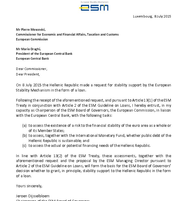 Στις 8 Ιουλίου του 2015 η Ελλάδα κατέθεσε αίτημα για στήριξη σταθερότητας από τον ESM, υπό τη μορφή δανείου.