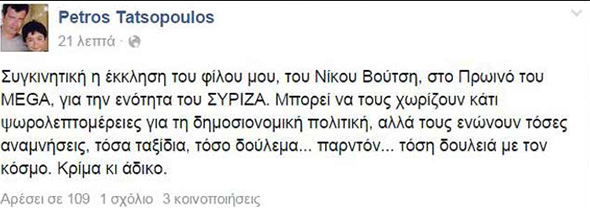 Με αιχμηρό τρόπο σχολίασε ο Πέτρος Τατσόπουλος την έκκληση, που απήθυνε ο υπουργός Εσωτερικών Νίκος Βούτσης για ενότητα εντός του ΣΥΡΙΖΑ. «Συγκινητική η έκκληση του φίλου μου, του Νίκου Βούτση, στο Πρωινό του ΜΕGA, για την ενότητα του ΣΥΡΙΖΑ. Μπορεί να τους χωρίζουν κάτι ψωρολεπτομέρειες για τη δημοσιονομική πολιτική, αλλά τους ενώνουν τόσες αναμνήσεις, τόσα ταξίδια, τόσο δούλεμα… παρντόν… τόση δουλειά με τον κόσμο. Κρίμα κι άδικο», έγραψε ο πρώην βουλευτής στον