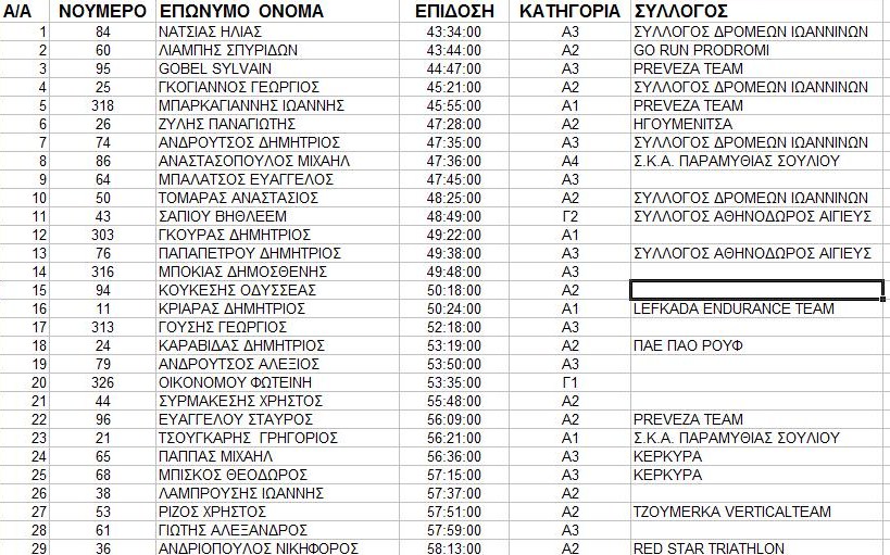 Στην κατηγορία των ανδρών πρώτευσε ο αθλητής του Συλλόγου Δρομέων Ιωαννίνων Νάτσιας Ηλίας με χρόνο 43,34’’, ενώ πρώτη αθλήτρια τερμάτισε η Σαπίου Βηθλεέμ από τον Σύλλογο Αθηνοδώρος ΑΙΓΙΕΥΣ με χρόνο 48,49’’.