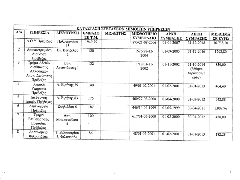 Ο Αναπληρωτής Υπουργός Οικονομικών, Τρύφων Αλεξιάδης, στην Απάντησή του επισήμανε ότι τα ακίνητα, τα οποία μισθώνει το Ελληνικό Δημόσιο στο Νομό Πρέβεζας για κάλυψη στεγαστικών αναγκών των Υπουργείων και Αποκεντρωμένων Διοικήσεων είναι (22) είκοσι δύο. Ειδικότερα, στον ακόλουθο πίνακα παρουσιάζονται αναλυτικά: