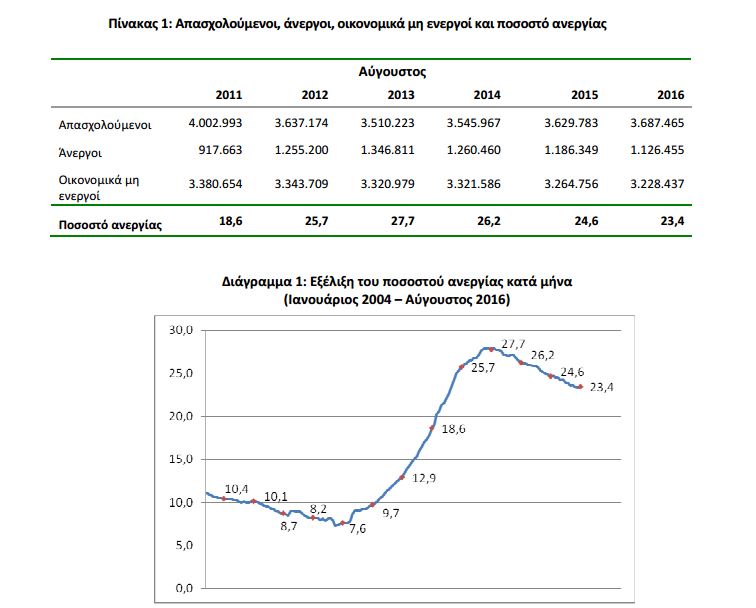 • Το εποχικά διορθωμένο ποσοστό ανεργίας τον Αύγουστο του 2016 ανήλθε σε 23,4% έναντι