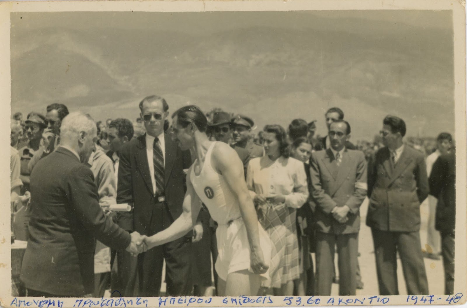 Εικ. 3: Απονομή τίτλου πρωταθλητή Ηπείρου στον ακοντισμό στον Δημήτριο Νάνο, 1947-8.