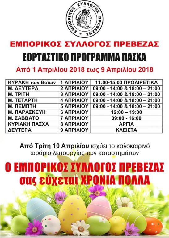 Το εορταστικό ωράριο των καταστημάτων του Εμπορικού Συλλόγου Πρέβεζας