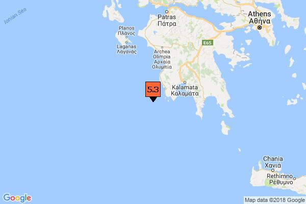 Σεισμός M 5.3, 25/06 08:14, βάθος 10 χλμ, 28 χλμ ΝΔ από Μεθώνη