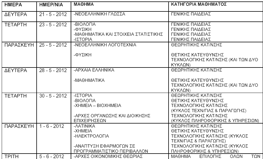 Το πρόγραμμα των πανελλαδικών εξετάσεων 2012
