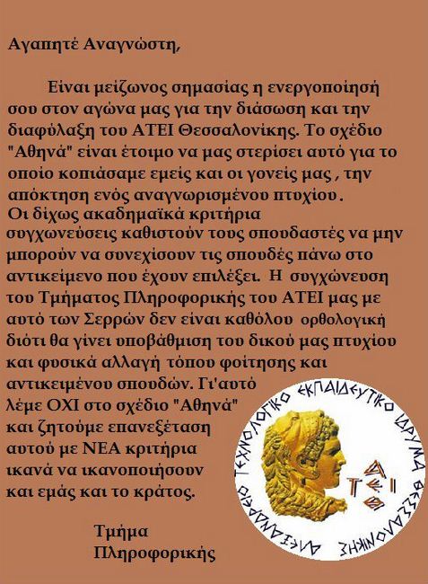 Αντιδράσεις των σπουδαστών του ΤΕΙ Θεσσαλονίκης για το σχέδιο ΑΘΗΝΑ