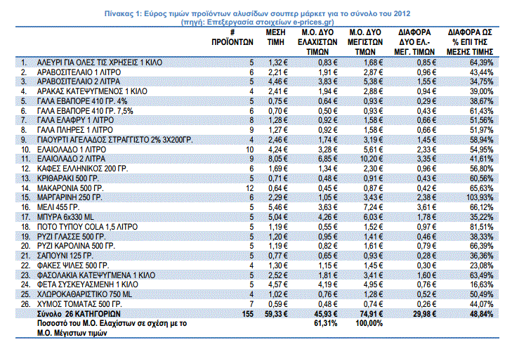 Η επεξεργασία των στοιχείων τιµών που παρέχει το παρατηρητήριο τιµών e-prices, των µεγάλων αλυσίδων σουπερ µάρκετ του Υπουργείου Ανάπτυξης από το ΙΕΛΚΑ, επιβεβαιώνουν αυτή την εικόνα. Τα στοιχεία του πίνακα 1 αφορούν το σύνολο του 2012 και παρουσιάζουν το εύρος των τιµών συγκρίνοντας την µέση τιµή της κατηγορίας, τον µέσο όρο των δύο ελάχιστων τιµών και τον µέσο όρο των δύο µέγιστων τιµών. Όπως δείχνουν τα αποτελέσµατα για το σύνολο των 155 προϊόντων από 26 κατηγορίες, τα προϊόντα αυτά µπορούν να αγοραστούν σε ένα εύρος της τάξης του 50% ανάλογα µε τις επιλογές που θα κάνει ο καταναλωτής.