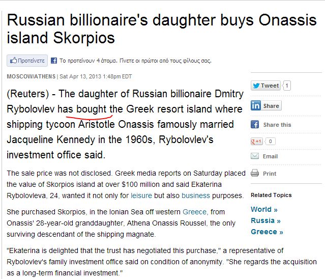 ''The daughter of Russian billionaire Dmitry Rybolovlev has bought the Greek resort island''