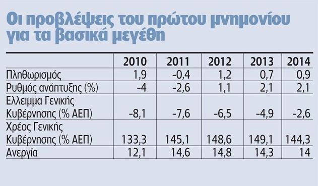 Ο αρχικός πίνακας των εκτιμήσεων του πρώτου μνημονίου και το τι ακολούθησε είναι ενδεικτικός των αστοχιών. Σύμφωνα με τις κοινές εκτιμήσεις τρόικας και κυβέρνησης: