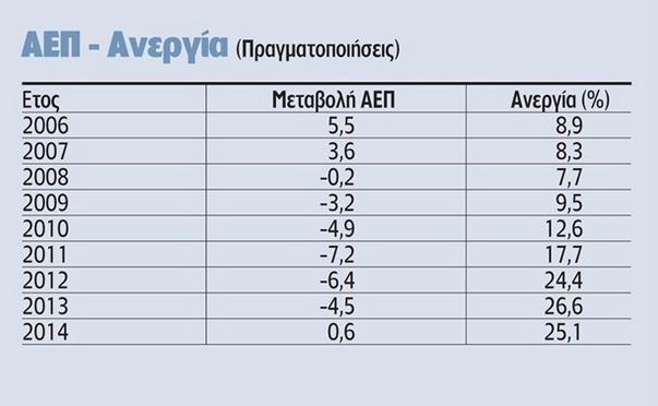 -6,4%, ενώ για το 2013 η τρέχουσα εκτίμηση είναι για ύφεση 4,5%. Η βαθύτερη ύφεση στέρησε τεράστια έσοδα από προϋπολογισμό και ασφαλιστικά ταμεία, αλλά η κυβέρνηση και η τρόικα, αντί να φρενάρουν την ύφεση, επέβαλαν κάθε φορά νέα μέτρα που επιδείνωναν την κατάσταση περισσότερο και απομακρύνοντας το ενδεχόμενο εξόδου της οικονομίας από την ύφεση. Ενδεικτικό είναι πως το 2012 το συνολικό ΑΕΠ ανήλθε σε 193.749 εκατ. ευρώ, από 233.198 εκατ. ευρώ το 2008, όταν ξεκίνησε η κρίση, με συνέπεια η σωρευτική μείωση του ΑΕΠ να φτάσει στο ποσό των 39.449 εκατ. ευρώ.