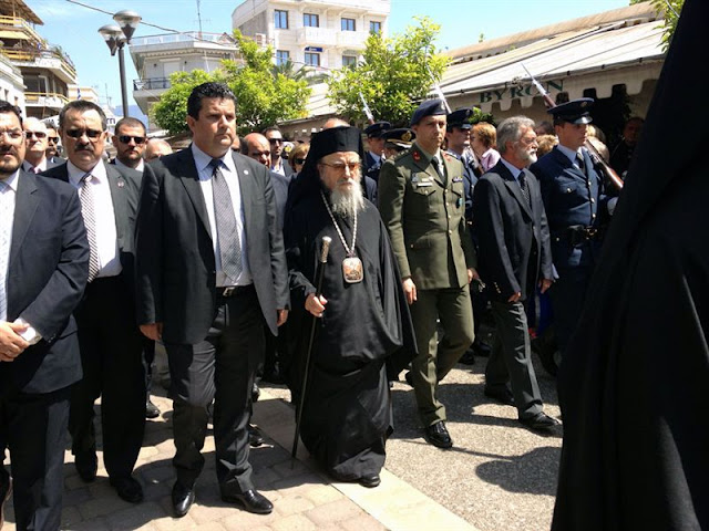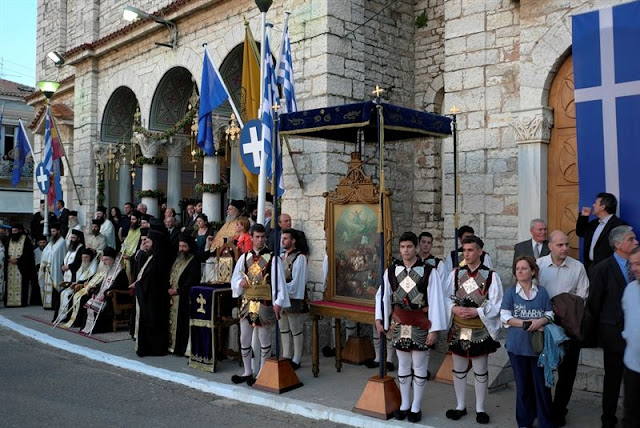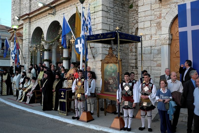 Αμέσως μετά ξεκίνησε η ιερά πομπή της Εικόνας της Εξόδου, από τον Ιερό Ναό με κατάληξη τον Κήπο των Ηρώων, με επικεφαλής τους αγίους Αρχιερείς και τον ιερό κλήρο. Προηγήθηκαν μαθητικές αντιπροσωπίες των Σχολείων της Ιεράς Πόλεως, μέλη πολιτιστικών συλλόγων και φιλαρμονικές, ενώ απέδωσαν τιμές αγήματα και των τριών Σωμάτων του Στρατού.