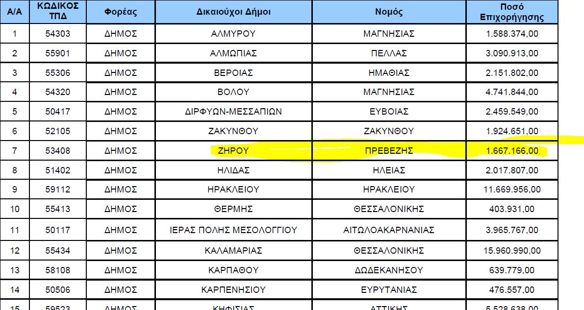 Ο δήμος Ζηρού εντάχθηκε στο πρόγραμμα επιχορήγηση από το ΥΠ.ΕΣ για ληξιπρόθεσμες υποχρεώσεις τους, με το ποσό των 1,67 εκ. ευρώ