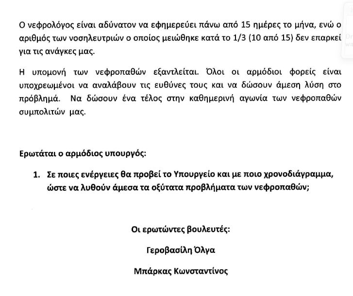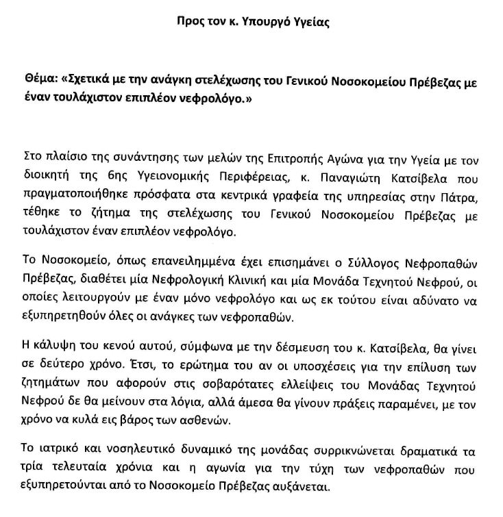 Ερώτηση στην Βουλή σχετικά με την ανάγκη στελέχωσης του Γενικού Νοσοκομείου Πρέβεζας με έναν τουλάχιστον επιπλέον νεφρολόγο