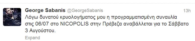 Από τον λογαριασμό του στο Twitter «Λόγω δυνατού κρυολογήματος μου η προγραμματισμένη συναυλία το Σάββατο 06/07 στο NICOPOLIS BEACH BAR στην Πρέβεζα αναβάλλεται για το Σάββατο 3 Αυγούστου».