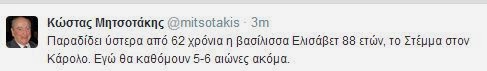 Δεν θα σταθούμε πολύ στην διαδοχή αλλά θα αναφέρουμε το χιουμοριστικό σχόλιο του fake Κώστας Μητσοτάκη από το Twitter ''Παραδίδει ύστερα από 62 χρόνια η βασίλισσα Ελισάβετ 88 ετών, το Στέμμα στον Κάρολο. Εγώ θα καθόμουν 5-6 αιώνες ακόμα.''
