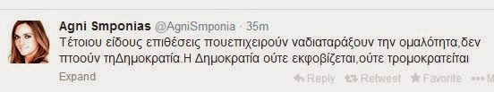 Μέσω του προσωπικού λογαριασμού της στο Twitter, η Αγνή Σμπόνια, έστειλε ένα αυστηρό μήνυμα, με αφορμή την επίθεση με μολότοφ κατά των γραφείων του Κινήματος.
