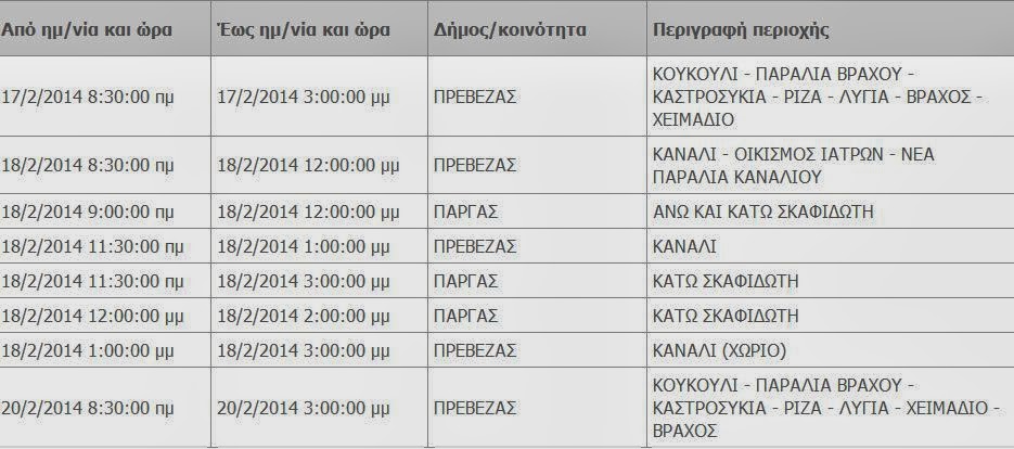 Προσοχή!!! Διακοπές ρεύματος σε πολλά δημοτικά διαμερίσματα Πρέβεζας & Πάργας