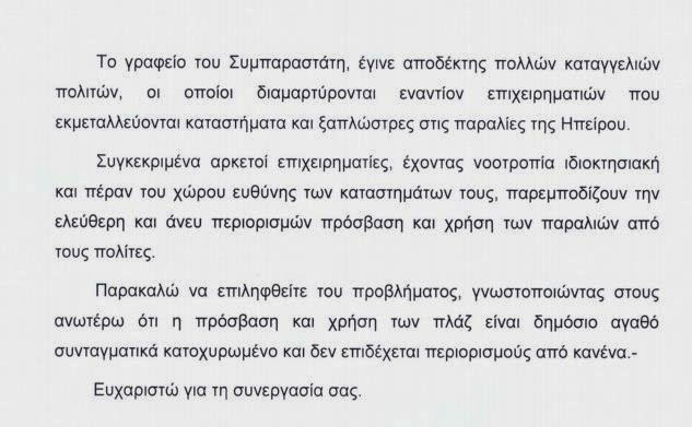 Πολλές καταγγελίες στο γραφείο συμπαραστάτη για τουριστικές επιχειρήσεις αιγιαλού