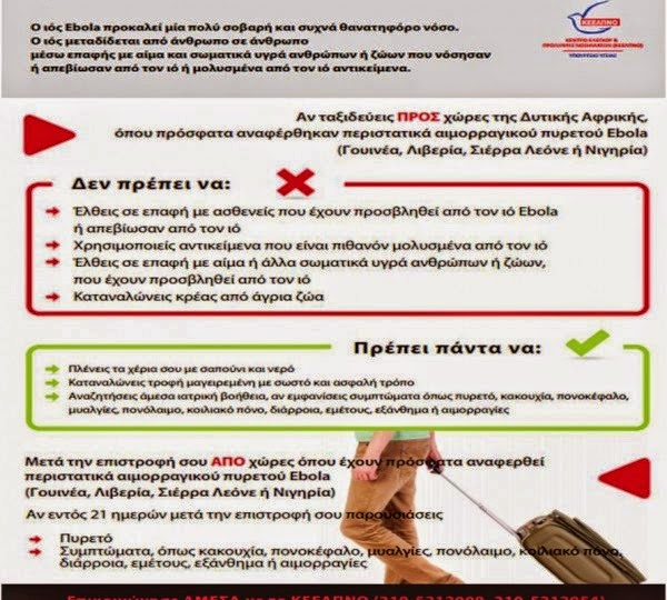Σε μια αναλυτική ανακοίνωση που συντάχθηκε με τη βοήθεια του ΚΕΕΛΠΝΟ αναφέρει τι είναι ο ιός, πως μεταδίδεται τι συστήνεται στους ταξιδιώτες και ποια μέτρα έχουν ήδη ληφθεί. Μεταξύ άλλων δόθηκε και στη δημοσιότητα μια αφίσα που θα τοποθετηθεί στις πύλες εισόδου της χώρας και αναφέρει χρήσιμες πληροφορίες για τον ιό στα Ελληνικά και στα Αγγλικά.