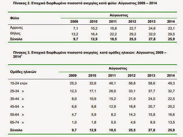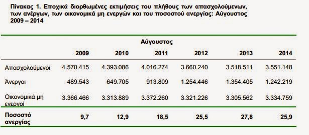 Το εποχικά διορθωµένο ποσοστό ανεργίας το Αύγουστο του 2014 ανήλθε σε 25,9% έναντι 27,8% τον Αύγουστο του 2013 και 26,1% τον Ιούλιο του 2014. Το εποχικά διορθωµένο πλήθος των απασχολουµένων κατά το Αύγουστο του 2014 εκτιµάται σε 3.551.148 άτοµα και των ανέργων σε 1.242.219 άτοµα, ενώ ο οικονοµικά µη ενεργός πληθυσµός ανήλθε σε 3.334.759 άτοµα
