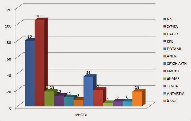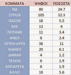 Τρίτη δύναμη η ΧΡΥΣΉ ΑΥΓΗ με διψήφιο ποσοστό ενώ ακολουθούν τα υπόλοιπα κόμματα.