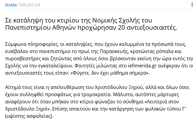 Λευτεριά στον Χριστόδουλο Ξηρό ζητάνε οι σύντροφοι καταληψίες στη Νομική.