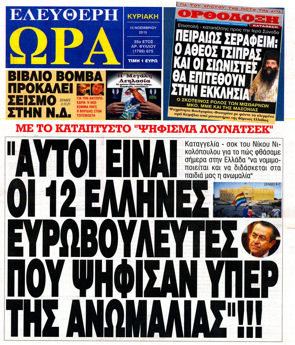 Τα πρωτοσέλιδα της Κυριακής 14-11-2015