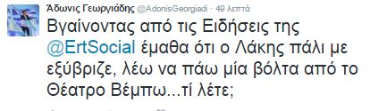 Απετράπη ίσως το μεγαλύτερο ξεκατίνιασμα της ελληνικής TV των τελευταίων ετών αφού ο Λαζόπουλος δεν άφησε τον Άδωνι να μπεί στο θέατρο Βέμπο. Αφορμή ήταν σχόλιο του Λαζόπουλου για την υποψηφιότητα Γεωργιάδη. Αυτός όταν ενημερώθηκε έκανε τις παρακάτω αναρτήσεις
