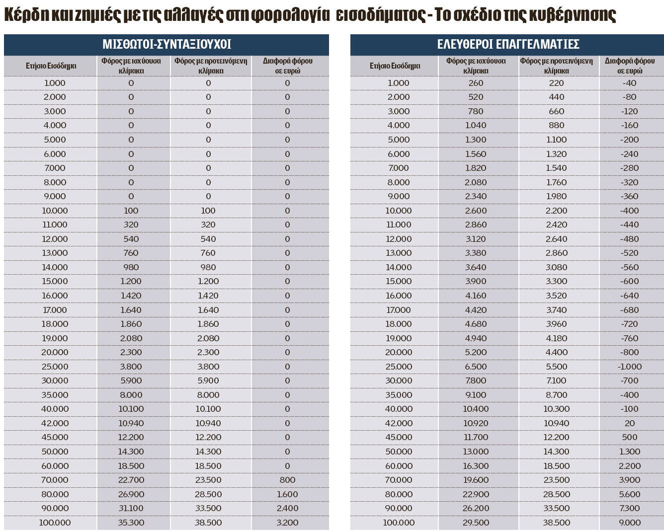Η έκπτωση μηδενίζεται στο επίπεδο ετησίου εισοδήματος των 42.000 ευρώ. Ουσιαστικά, για τους μισθωτούς και τους συνταξιούχους παραμένει το έμμεσο αφορολόγητο όριο των 9.550 ευρώ.Όσοι αποκτούν εισοδήματα αποκλειστικά από μισθούς και συντάξεις δεν θα έχουν καμία μεταβολή στη φορολογική τους επιβάρυνση, εφόσον τα εισοδήματά τους δεν υπερβαίνουν τις 60.000 ευρώ. Αντίθετα περισσότερους φόρους θα κληθούν να πληρώσουν όσοι αποκτούν εισοδήματα άνω των 60.000 ευρώ, με την προσθήκη του συντελεστή 50%.3. Ελεύθεροι επαγγελματίες - ατομικές επιχειρήσεις: Προτείνεται νέα κλίμακα φορολόγησης των εισοδημάτων τους η οποία θα αντικαταστήσει την ισχύουσα που προβλέπει επιβολή φόρου με συντελεστή 26% από το πρώτο ευρώ και μέχρι 50.000 ευρώ και 33% για το τμήμα του εισοδήματος άνω τω 50.000 ευρώ.Η προτεινόμενη κλίμακα είναι όμοια με αυτή των μισθωτών - συνταξιούχων, δηλαδή θα ισχύουν οι συντελεστές 22%, 32%, 42% και 50% με την διαφορά ότι ο φόρος θα επιβάλλεται από το πρώτο ευρώ. Όσοι αποκτούν αποκλειστικά εισόδημα από επιχειρηματική δραστηριότητα είναι κερδισμένοι με την εφαρμογή της νέας ενιαίας κλίμακας, εφόσον το ετήσιο εισόδημά τους είναι μέχρι 42.000 ευρώ. Δηλαδή 9 στους 10 αυτοαπασχολούμενους θα έχουν φορολογικό όφελος.Για όσους δηλώνουν πάνω από 25.000 και μέχρι 41.000 ευρώ, στο τμήμα του ετησίου εισοδήματος πάνω από τα 25.000 ευρώ θα ισχύει μεν συντελεστής φόρου αυξημένος από το 26% στο 32% αλλά οι επιβαρύνσεις αντισταθμίζονται από τη μείωση του φόρου στο πρώτο κλιμάκιο εισοδήματος (από 26% σε 22%). Για όσους δηλώνουν ετήσια εισοδήματα από 42.000 ευρώ και πάνω, η νέα κλίμακα φέρνει περισσότερους φόρους.4. Εισοδήματα από ενοίκια: Αντιμέτωποι με μεγάλες επιβαρύνσεις θα βρεθούν οι περίπου 1,7 εκατ. φορολογούμενοι που εισπράττουν εισοδήματα από ακίνητα. Η κλίμακα που προτείνεται να εφαρμοστεί για τα εισοδήματά τους, διαμορφώνεται ως εξής:• 15% από 11% σήμερα για τα εισοδήματα έως 12.000 ευρώ. Οι έχοντες εισοδήματα έως 12.000 ευρώ από ενοίκια -είναι τα 1,6 εκατομμύρια από τα 1,7 εκατομμύρια των φορολογουμένων που έχουν λαμβάνειν από τη συγκεκριμένη κατηγορία εισοδήματος- θα πληρώσουν 36% περισσότερο φόρο σε σχέση με πέρυσι. Για παράδειγμα για εισόδημα 10.000 ευρώ θα προκύψει πρόσθετος φόρος 400 ευρώ.• 35% από 33% για το τμήμα του εισοδήματος από τις 12.000 έως τις 40.000 ευρώ.• Νέος συντελεστής 40% ή 45% προτείνεται να επιβληθεί για το τμήμα του εισοδήματος άνω των 40.000 ευρώ.ΠαραδείγματαΦορολογούμενος αποκτά εισόδημα από ακίνητα 5.000 ευρώ.• Φόρος με την ισχύουσα κλίμακα: 550 ευρώ• Φόρος με προτεινόμενη κλίμακα: 750 ευρώ.• Πρόσθετος φόρος: 200 ευρώ.Φορολογούμενος με εισόδημα από ενοίκια 10.000 ευρώ.• Φόρος με την ισχύουσα κλίμακα: 1.100 ευρώ.• Φόρος με προτεινόμενη κλίμακα: 1.500 ευρώ.• Πρόσθετος φόρος: 400 ευρώ.Φορολογούμενος με εισόδημα από ενοίκια 20.000 ευρώ.• Φόρος με την ισχύουσα κλίμακα: 3.960 ευρώ.• Φόρος με προτεινόμενη κλίμακα: 4.600 ευρώ.• Πρόσθετος φόρος: 640 ευρώ.5. Για τους αγρότες, θα εξακολουθεί να ισχύει η αυτοτελής φορολόγηση του εισοδήματος που προέρχεται από γεωργικές δραστηριότητες, η δε αύξηση του συντελεστή από το 13% που είναι σήμερα στο 26% που προβλέπει το Μνημόνιο προτείνεται να γίνει σταδιακά, σε βάθος τεσσάρων ετών.6. Όλες οι αλλαγές στη φορολογία εισοδήματος φυσικών προσώπωνθα ισχύσουν για τα εισοδήματα που αποκτώνται από την 1η Ιανουαρίου 2016 και μετά. Ως εκ τούτου οι φορολογικές επιβαρύνσεις ή ελαφρύνσεις που προκύπτου