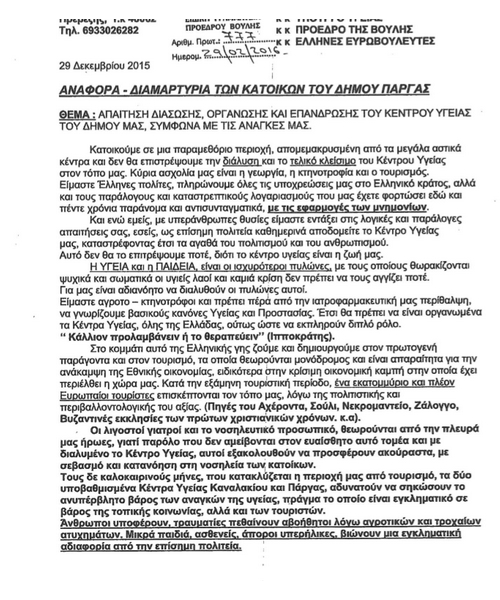 Οι Βουλευτές της Δημοκρατικής Συμπαράταξης Εύη Χριστοφιλοπούλου και Δημήτρης Κωνσταντόπουλος κατέθεσαν Αναφορά στη Βουλή σχετικά με τη διαμαρτυρία κατοίκων του Δήμου Πάργας για τη διάσωση, οργάνωση και επάνδρωση του Κέντρου Υγείας Πάργας και ζητούν από τον Υπουργό Υγείας την ενημέρωσή τους για τις ενέργειες στις οποίες σκοπεύει να προβεί το Υπουργείο.