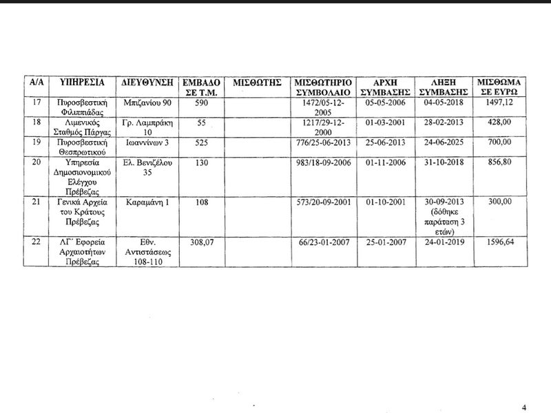 Ο Αναπληρωτής Υπουργός Οικονομικών, Τρύφων Αλεξιάδης, στην Απάντησή του επισήμανε ότι τα ακίνητα, τα οποία μισθώνει το Ελληνικό Δημόσιο στο Νομό Πρέβεζας για κάλυψη στεγαστικών αναγκών των Υπουργείων και Αποκεντρωμένων Διοικήσεων είναι (22) είκοσι δύο. Ειδικότερα, στον ακόλουθο πίνακα παρουσιάζονται αναλυτικά: