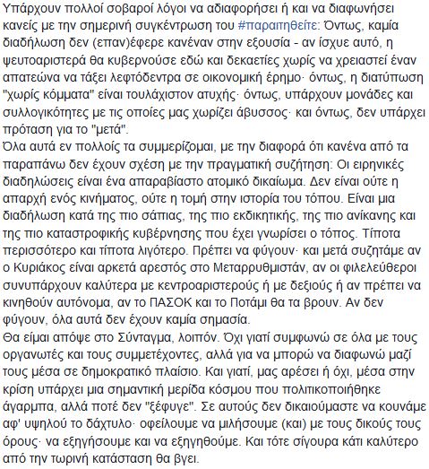 Δεν θα μπούμε στην αντιπαράθεση των κομμάτων, αλλα αναδημοσιεύουμε την γνωμη ενός πολίτη που θα βρεθεί το απόγευμα στο Σύνταγμα
