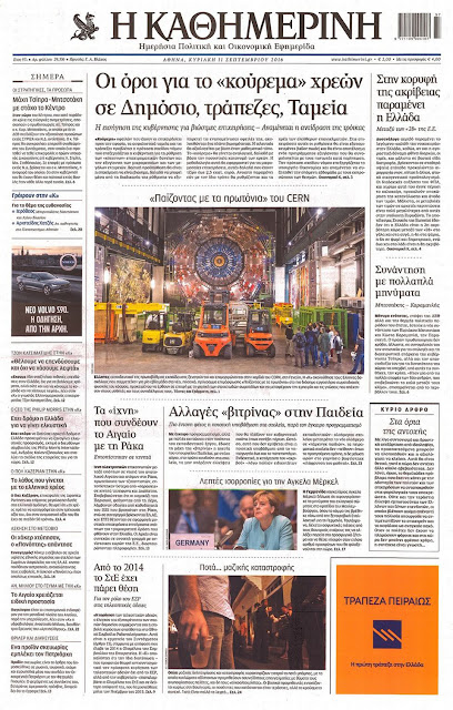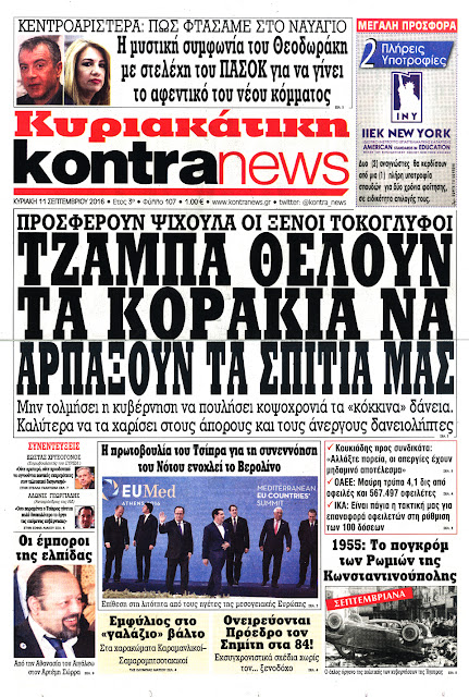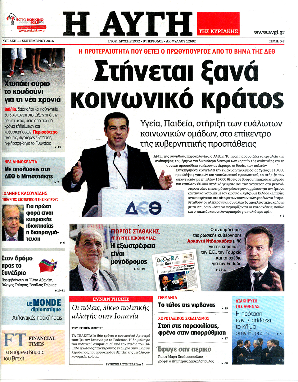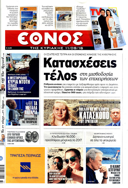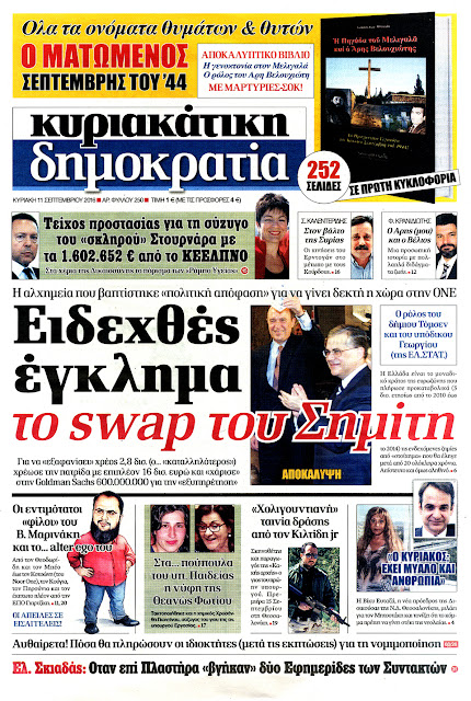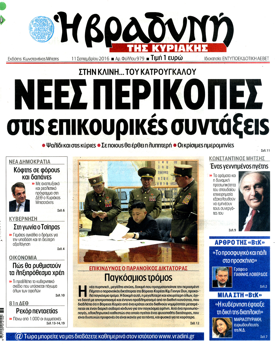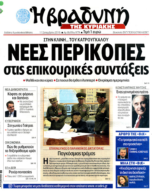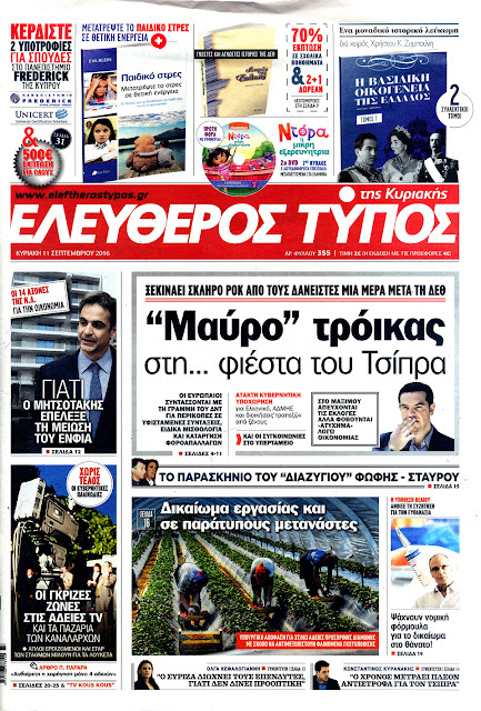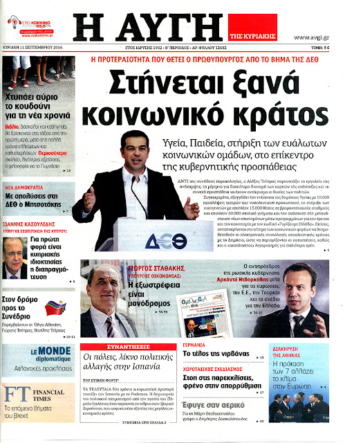 Τα πρωτοσέλιδα της Κυριακής 11-9-2016
