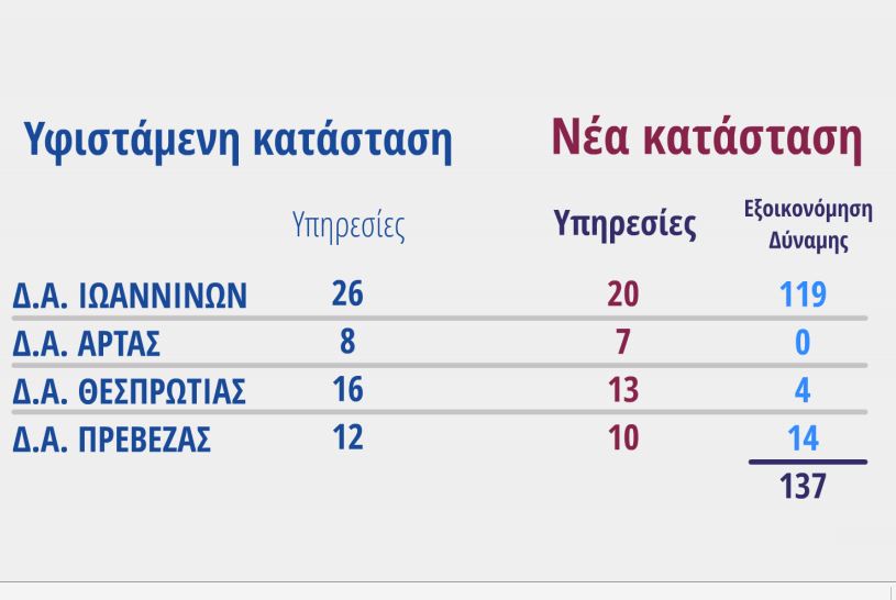 Στην Ήπειρο η κίνηση αυτή, έχει σαν αποτέλεσμα την μείωση 12 υπηρεσιών, 6 στα Ιωάννινα, 3 στην Θεσπρωτία, 2 στην Πρέβεζα και μόλις 1 στην Άρτα.