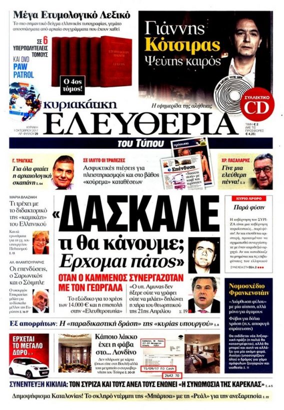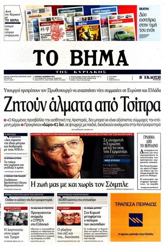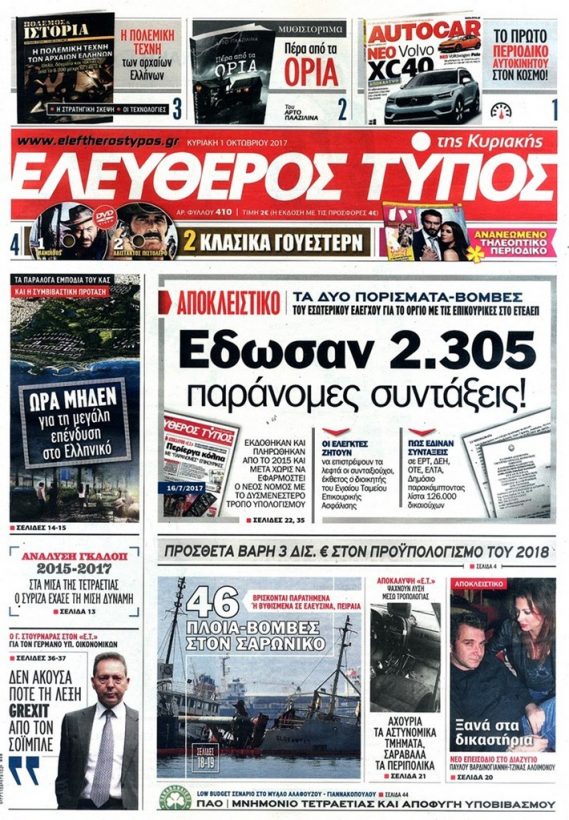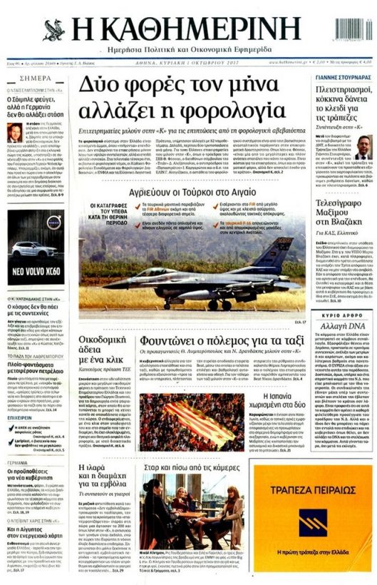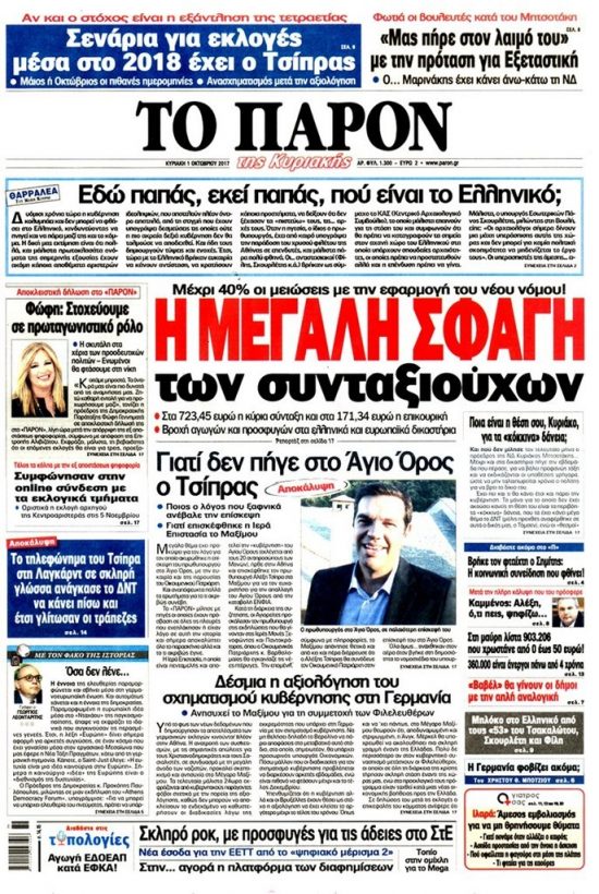 Τα πρωτοσέλιδα της Κυριακής 1-10-2017