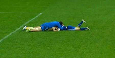Στο διαιτητής- σφαγέας του αγώνα με ανύπαρκτο πέναλτι και με μια άδικη κόκκινη κάρτα στον Καπίνο φάνηκε να καταδικάζει την εθνική λίγο πριν το ημίχρονο, αλλα ο Διούτης ο αντικαταστάτης του Καπίνου με μια εκπλητική απέκρουση κράτησε το 1-0 στο ημίχρονο.