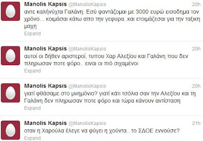 Έξαλλη έγινε η τραγουδίστρια Χάρις Αλεξίου με το σχόλιο του Μανώλη Καψή στο twiiter στο οποίο γράφει: «αυτοί οι δήθεν αριστεροί, τύπου Χαρ Αλεξίου και Γαλάνη που δεν πλήρωσαν ποτέ φόρο.. είναι οι πιο σιχαμένοι».