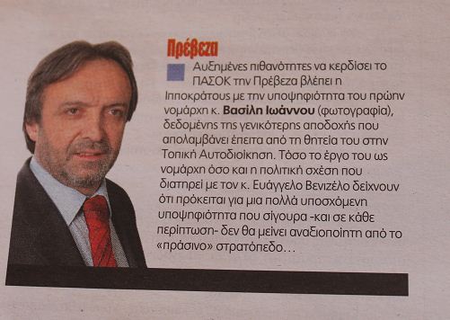 Πολιτική δήλωση του υποψήφιου Βουλευτή ΠΑΣΟΚ Ν. Πρέβεζας, κ. Περικλή Βασιλάκη