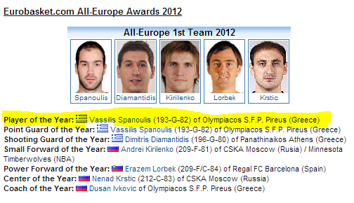 Eurobasket.com Καλύτερος παίκτης για το 2012 στην Ευρώπη ο Βασίλης Σπανούλης.